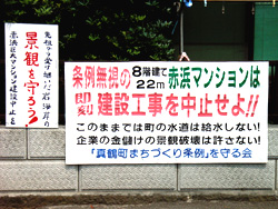 町役場の職員やマンション建設に反対する住民は、『美の条例』が制定され先進事例として大きく取り上げられた頃から、すでに今日のような問題が生じうることをある程度予想していたようだ。ただ、事業者から「上乗せ」「横だし」といった批判は受けても、住民の総意で策定されすでに先進事例として世に名高い『美の条例』の存在自体が否定されるような展開には、まさかそこまで、という思いも隠しきれない様子である。